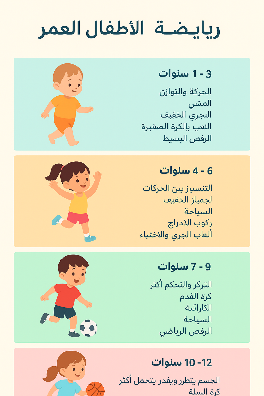 رياضة الأطفال لها أهمية كبيرة في تعزيز صحتهم ونموهم البدني والعقلي. إليكِ بعض الأفكار حول الرياضات والأنشطة المناسبة للأطفال حسب أعمارهم الأهم هو يخلي الطفل يستمتع وما يحسش بالضغط، والرياضة تكون آمنة ومناسبة لقدراته.